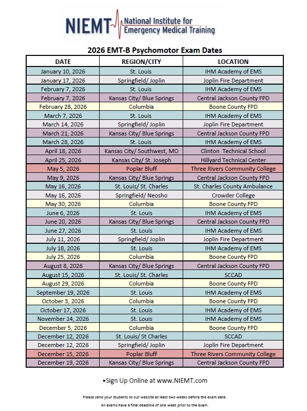 Missouri EMT-B Psychomotor Examinations are closed to anyone outside of the state. The NIEMT Psychomotor Examination is a Missouri test only and we do not allow other states to test in Missouri. If you are coming from the Army, Air Force, Coast Guard, Marine Corps, Navy or similar, please contact the Missouri Bureau of EMS to check for special considerations.